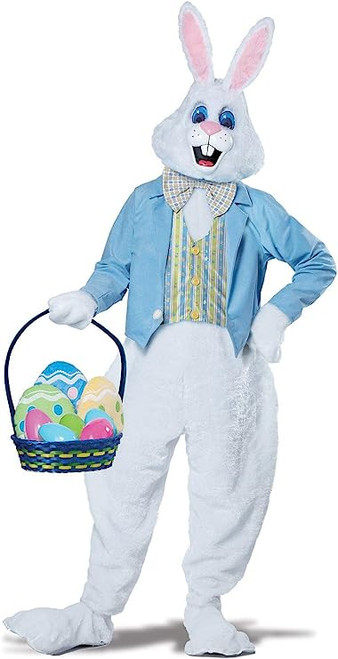 Hop to it this spring with this delightful Deluxe Easter Bunny costume. It includes a fur body suit with attached vest and jacket, a bunny head with mesh eyes and attachable ears, a pair of bunny mittens and shoe covers. Basket with eggs not included.